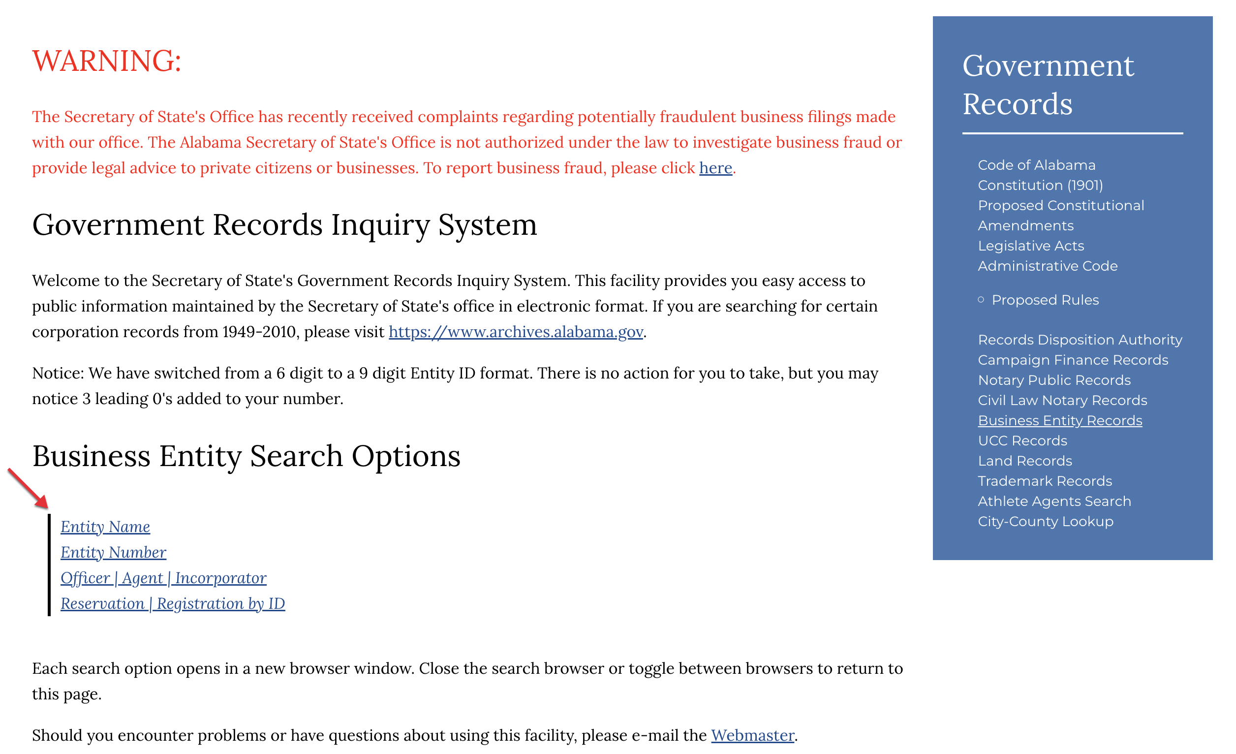 1. Go to the Business Entity Records webpage
