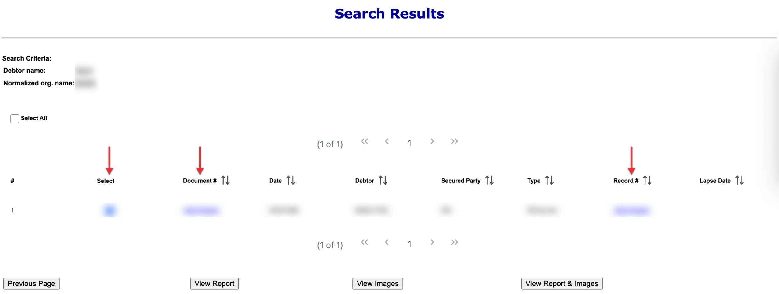 The next page shall display the entity’s current transactions by document number. This table will allow its content to be sorted in ascending or descending order using the arrows provided in the column headings. To quickly view a transaction, select either its “Document #” or its “Record #.”