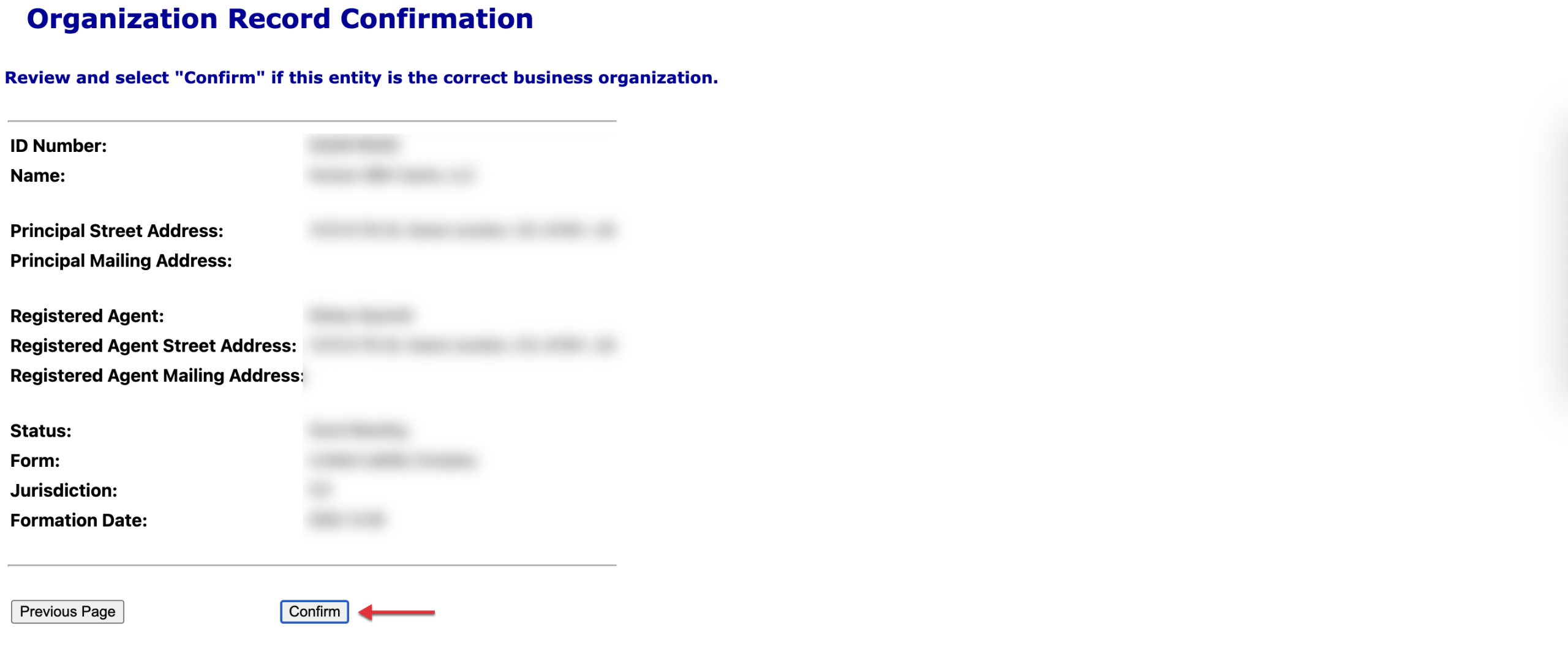 Look for and then obtain the details you require from the “Organization Record Confirmation” page. Here, the business entity’s name and contact information, along with its registered agent’s name and contact information, are displayed with some basic details.