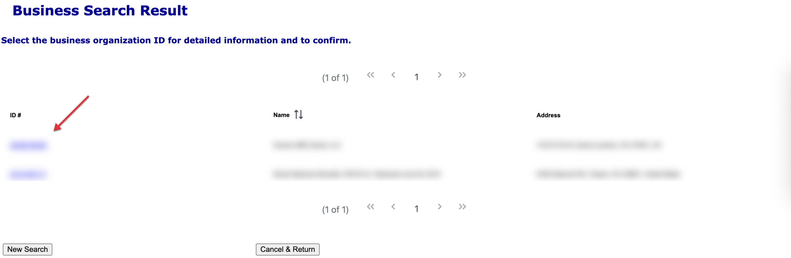 Satisfy the “Organization Name” search box by entering the name (partial or full) of the concerned business entity. Alternatively, a search may also be performed using the business entity’s ID number by supplying it to the text box labeled “Organizational ID#” but we will conduct a search by name.
