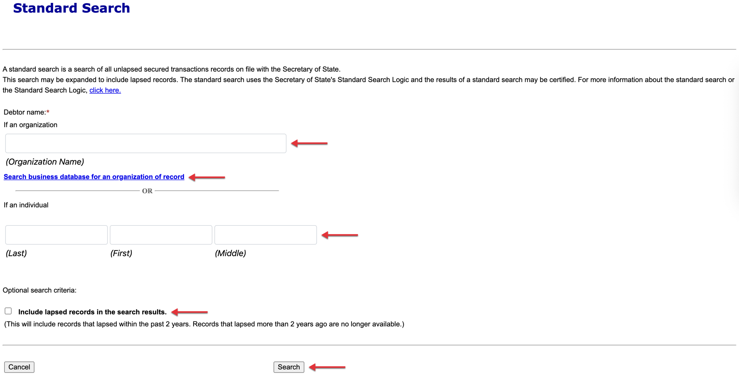 The “Standard Search” may be conducted on both business entities and individuals (i.e., independent contractors) who are debtors; however, our example shall focus on registered business entities.