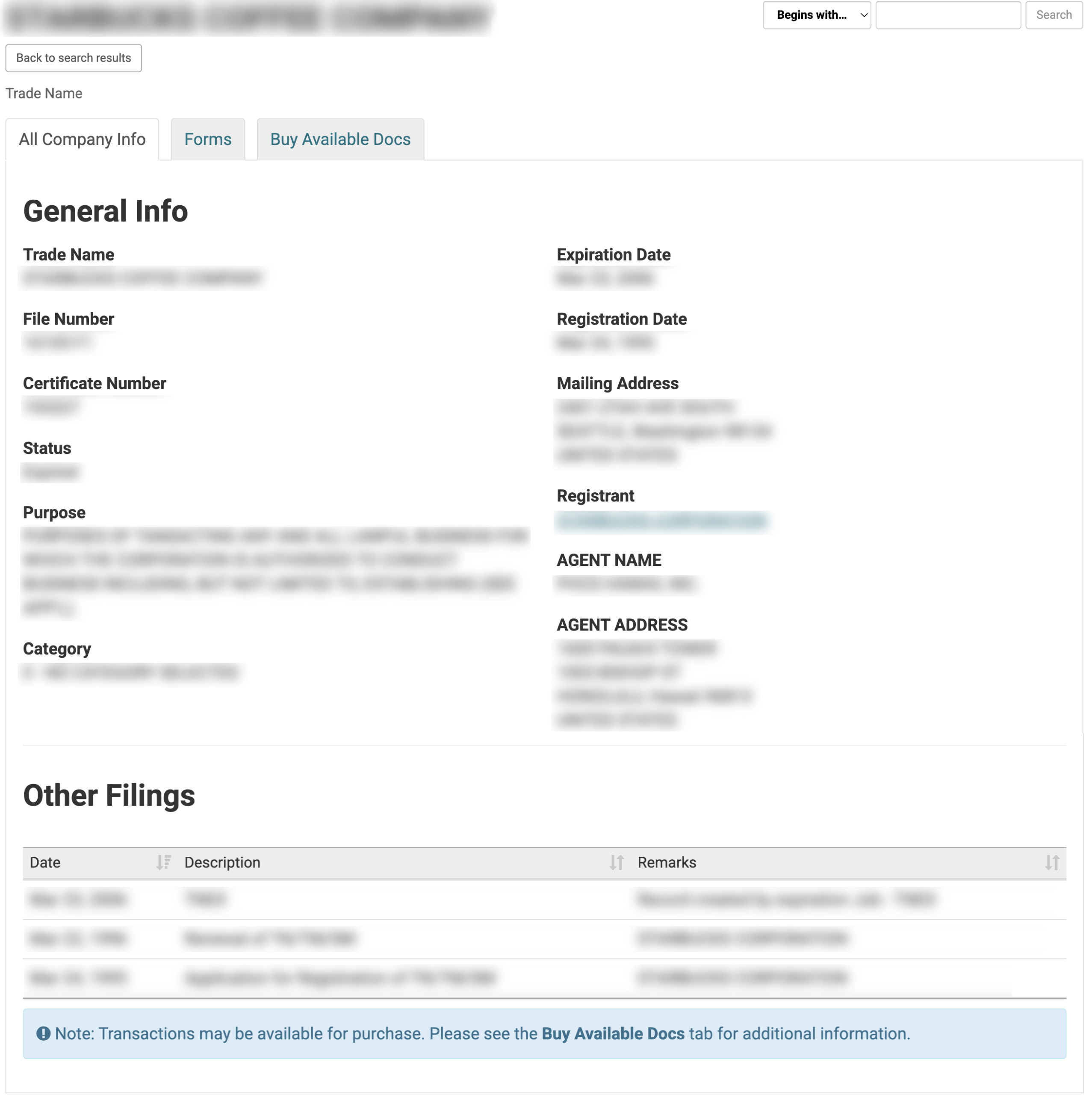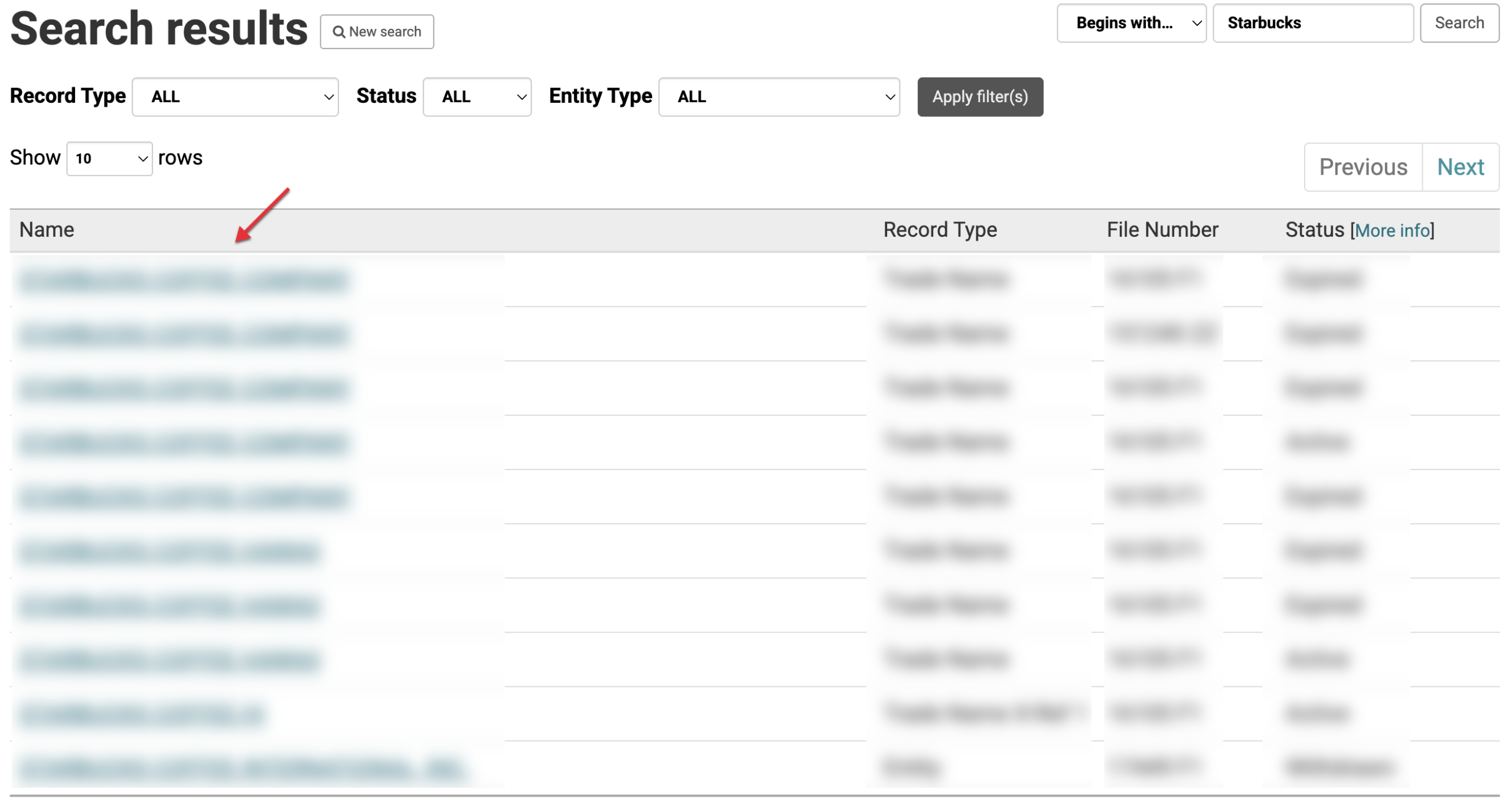 The search tool will produce the results of your inquiry in a convenient table. The first column will contain the name of the business discussed, while the remaining columns contain the filing information for that entity.