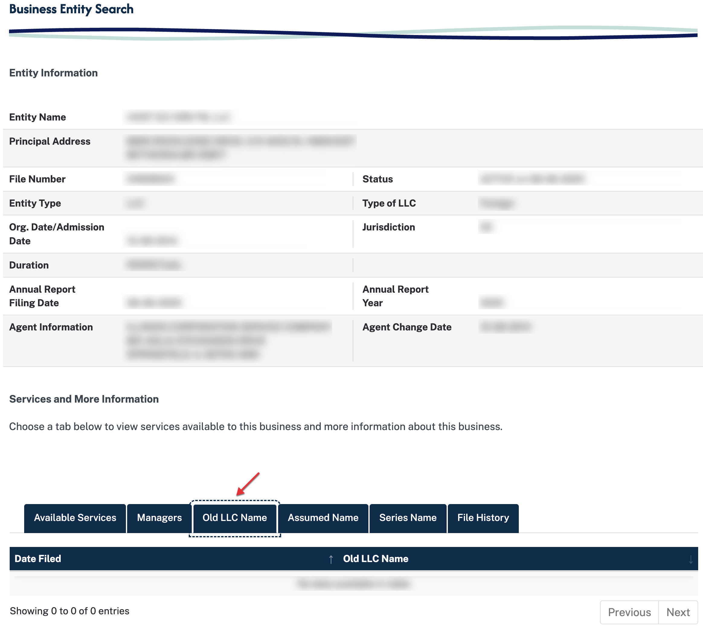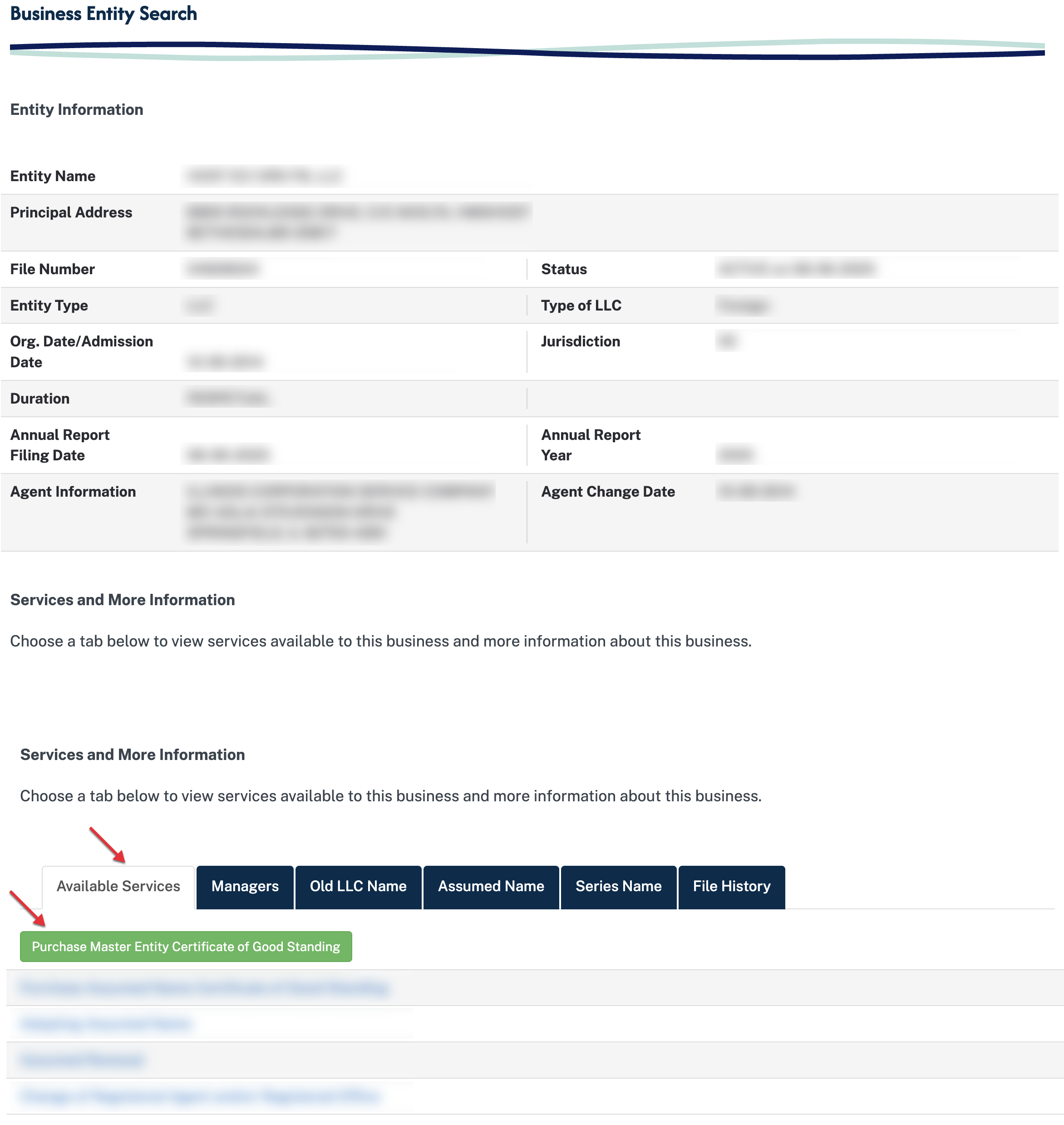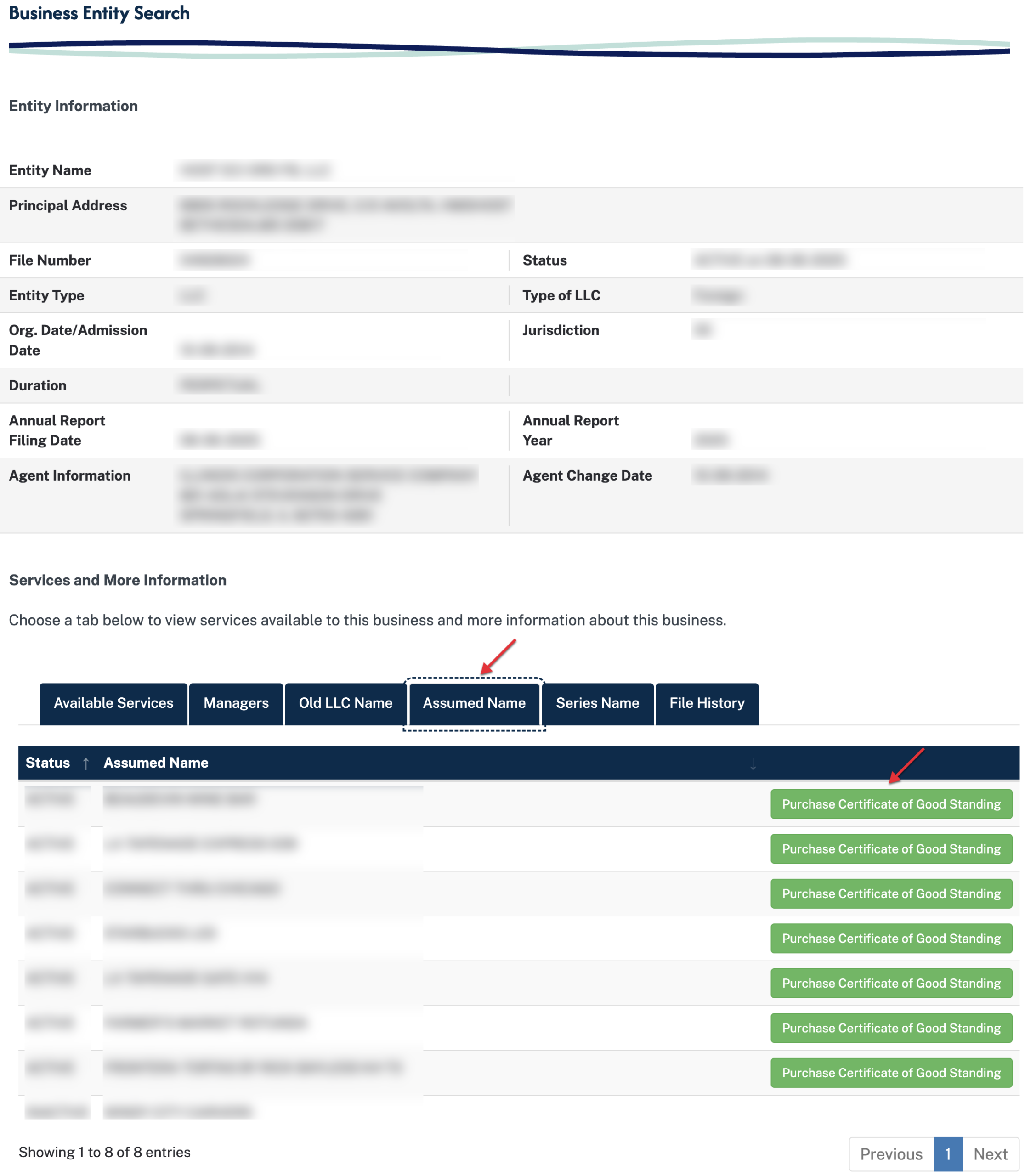 To view any assumed names the entity has operated under (or currently does), choose the fourth tab to see each such name as well as its current status. Note that the option to purchase a Certificate of Good Standing may be available.