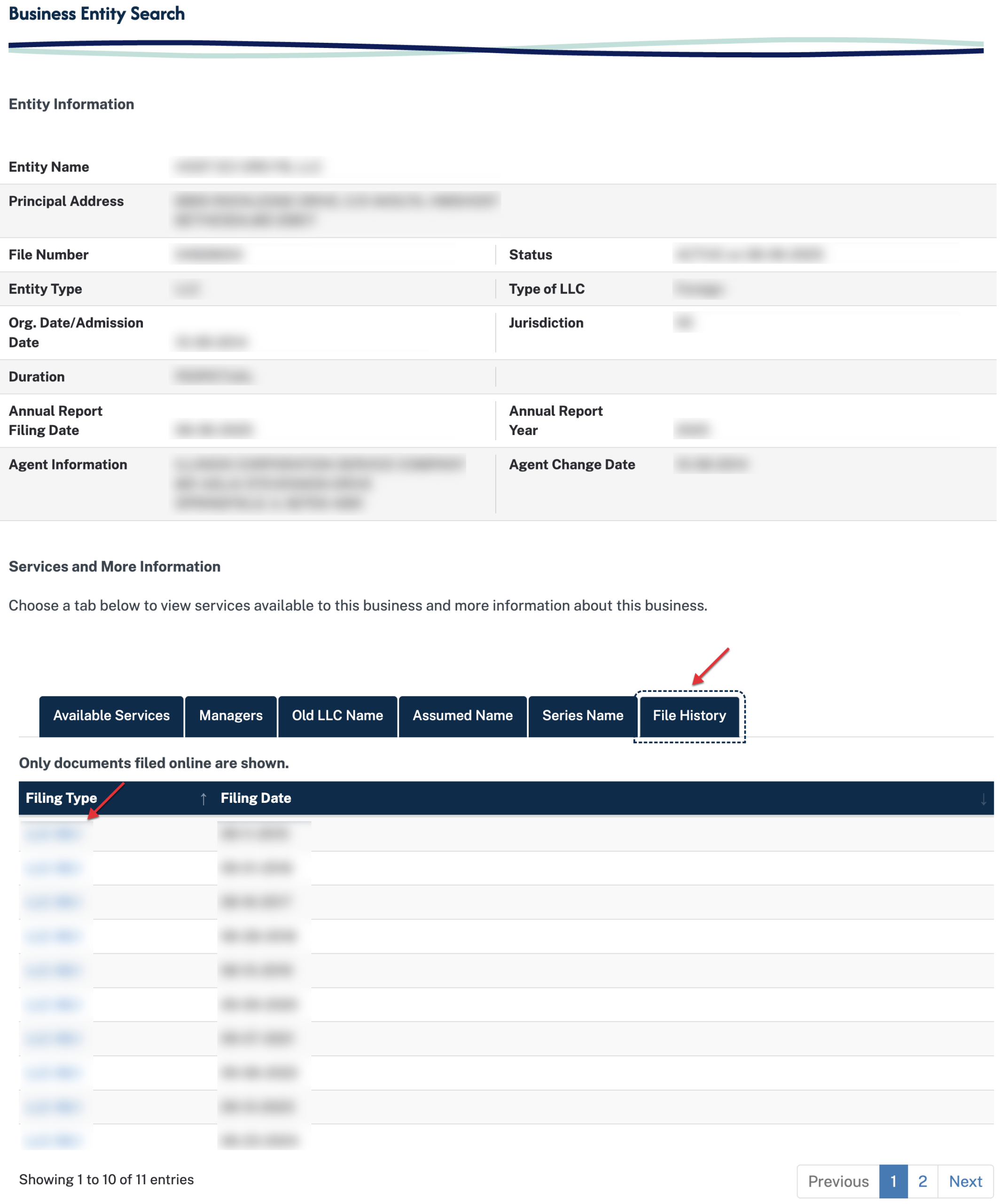 Finally, to review the entity’s previous filings, including their dates, use the mouse button to select the last tab on the right.