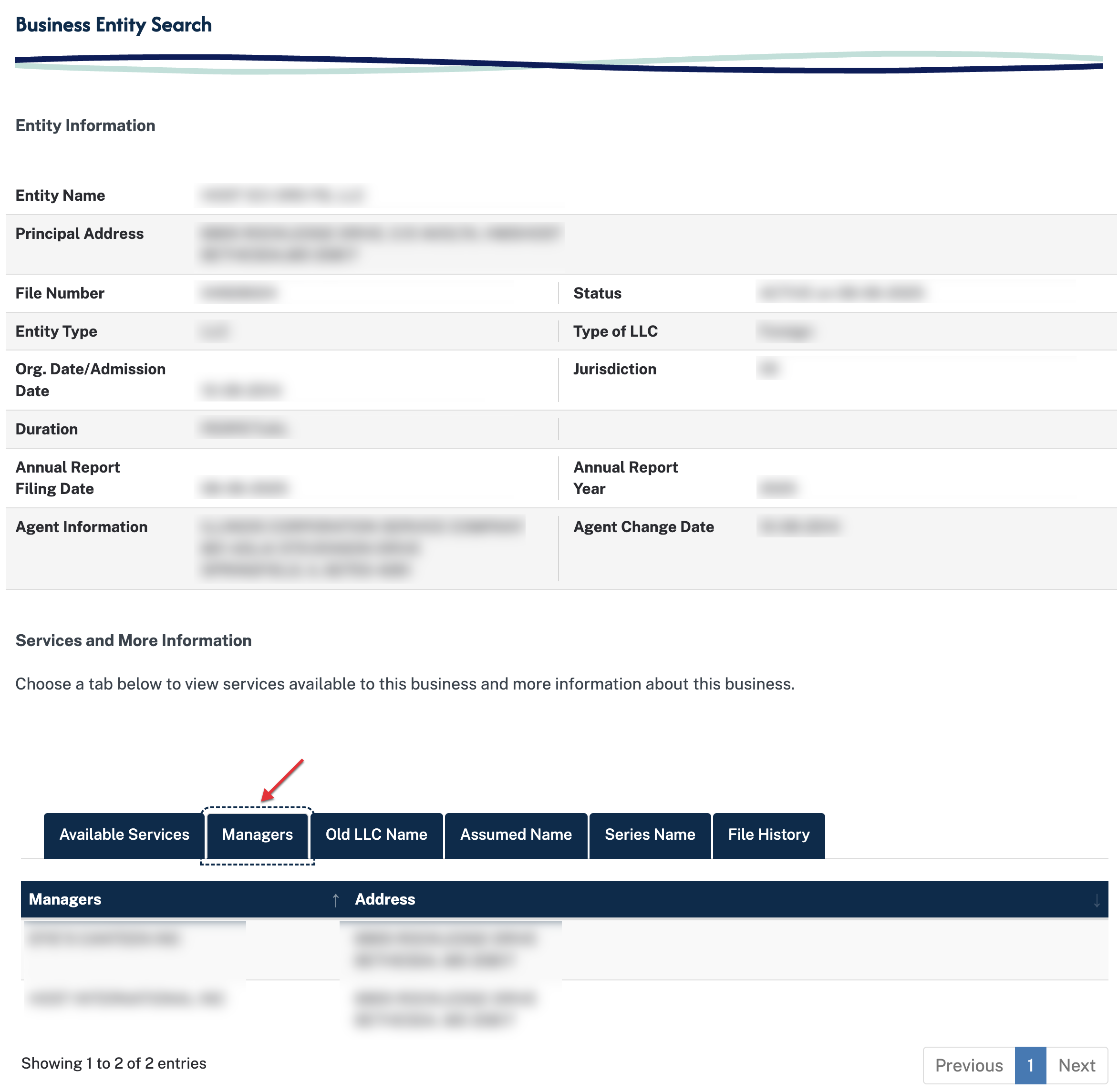 Select the second tab labeled “Manager” (or “Officer” if investigating a corporation) to view each entity manager’s (or officer’s) title, name, and address.