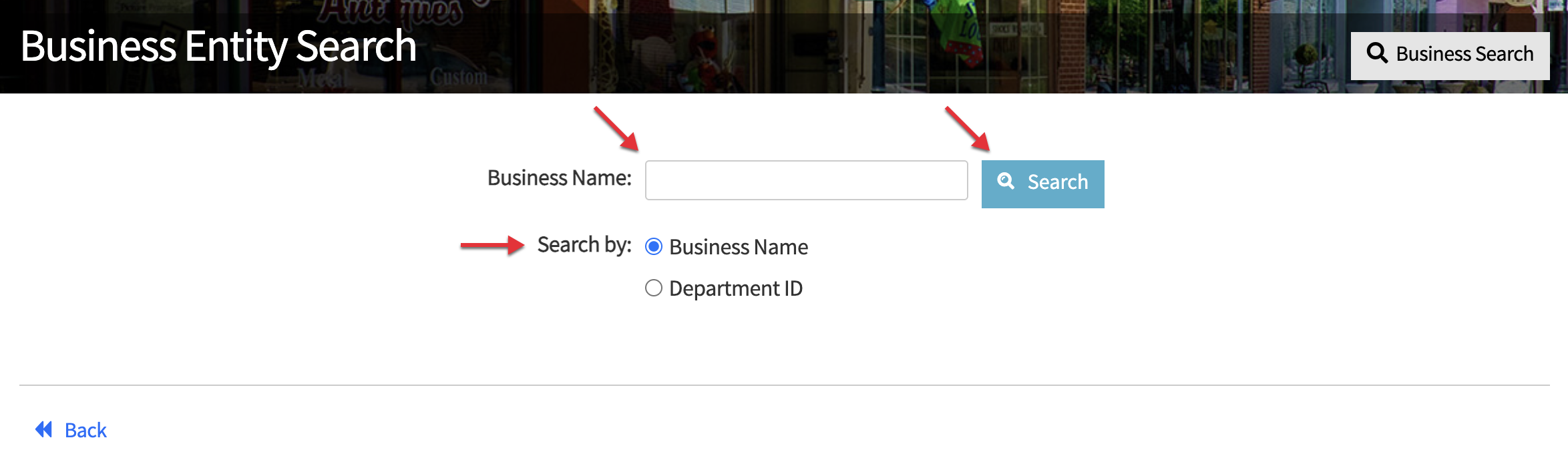 After the page has been accessed, produce either the full name of the Maryland business you wish to view or part of its name in the text box, select “Business Name,” and press the “Search” button with your mouse.