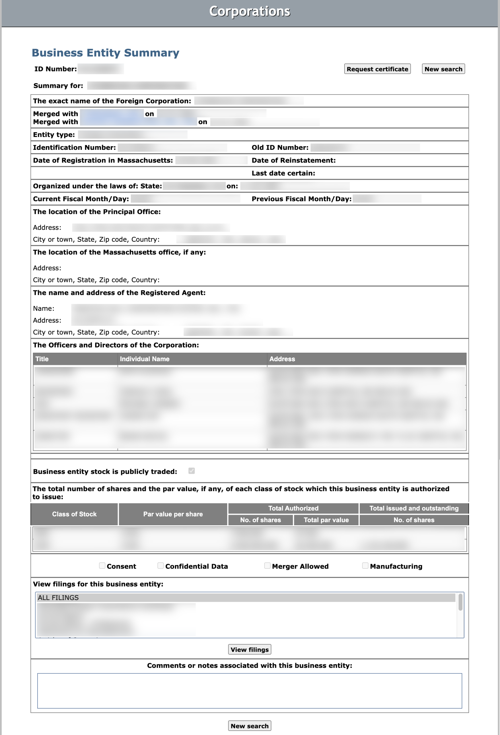 If the Massachusetts entity can issue stock, a statement will confirm this fact via checkmark. Here, you can peruse certain details in the display area.