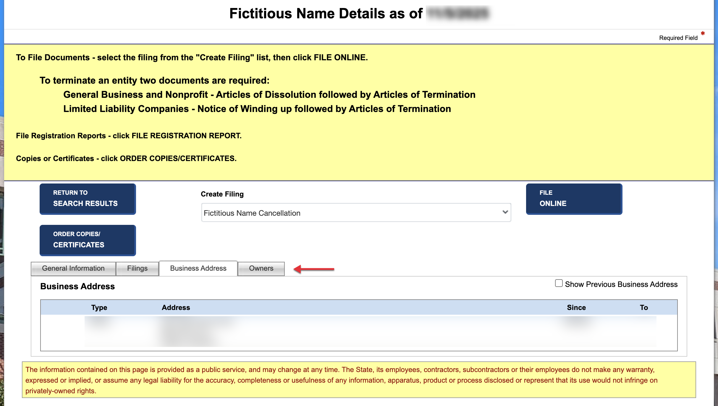 Determine whether the registration reports should be included in the entity’s filing history. If so, then leave the checkmark on the right selected; if not, remove the default checkmark by clicking on it. The filing history will show the exact time and date of the last update to this area. Review the information presented. In cases where the paperwork is available to view on screen, select the “View Document” button in the first column (and on the same row) of the concerned filing. Then, if desired, select the “Principal Office Address” to discover more information. If not, you can return to the search results by using the button on the left.