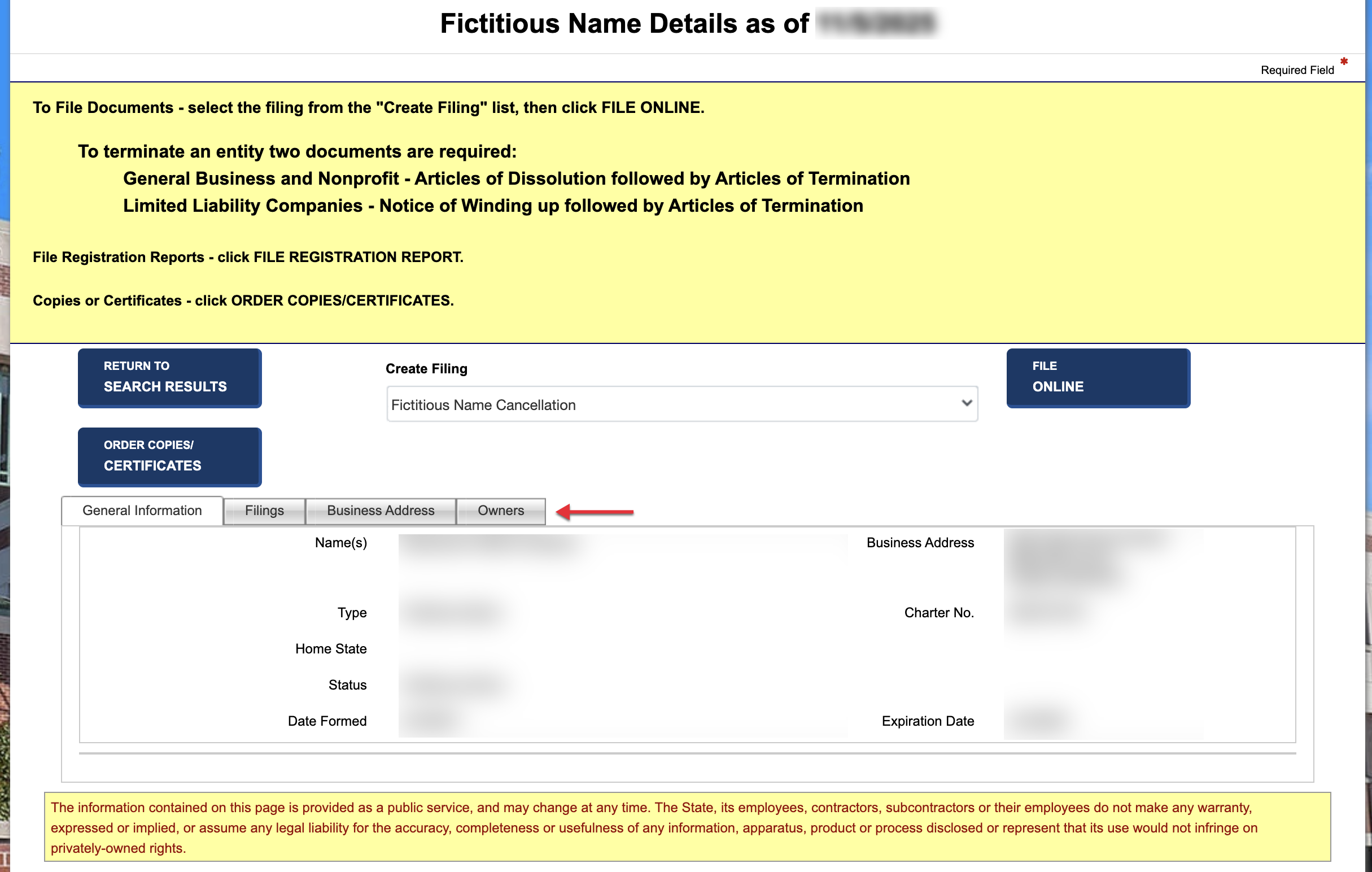 After the Missouri entity’s “General Information” section opens on a new page, review the basic details presented. If this is the desired entity, then continue to review the available tabs.