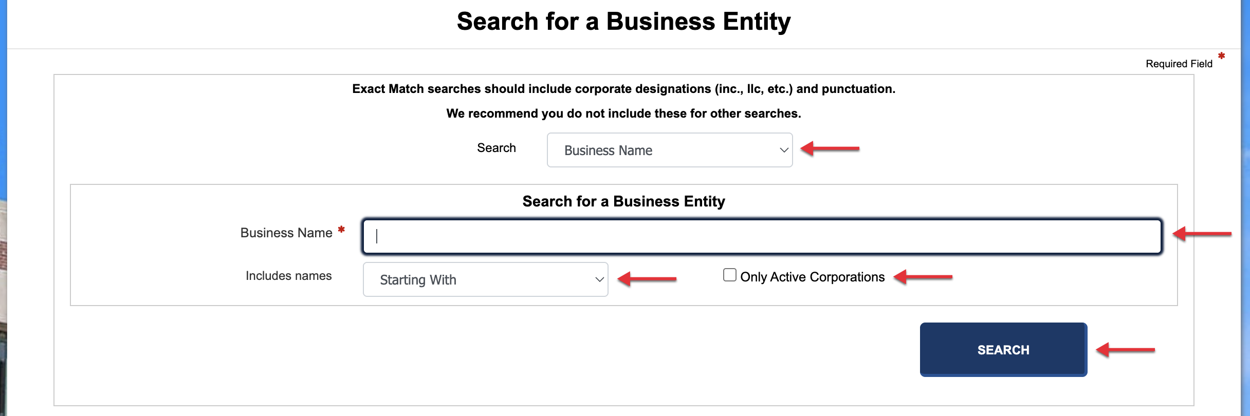 First, define what is being searched by selecting the first option from the first drop-down menu. Several items can potentially define the search; however, we shall search for a business’s name in this example.