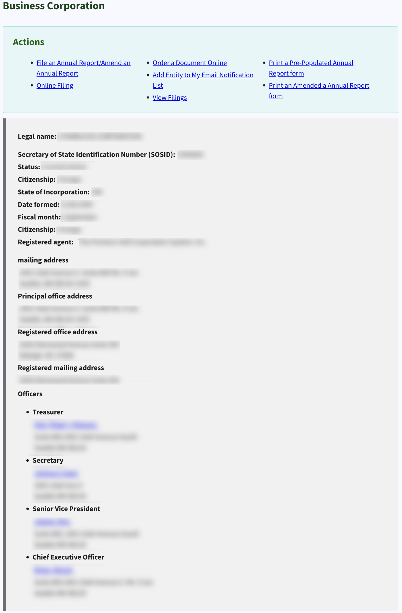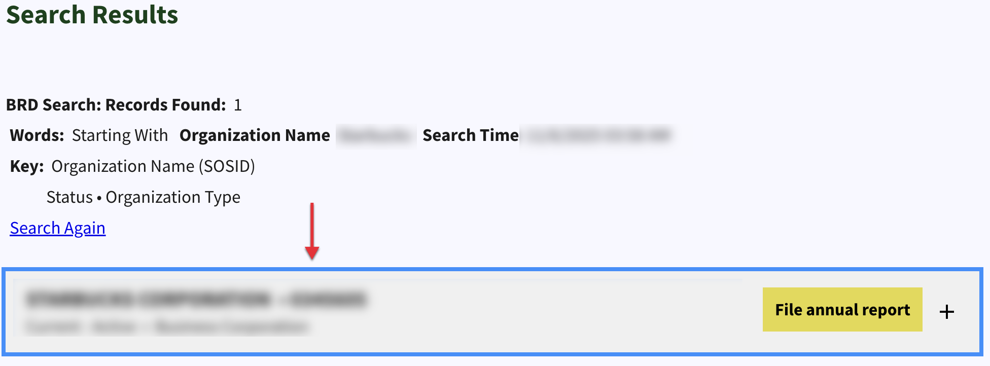 Review the basic information regarding the initiated search at the top of the page. Next, direct your attention to the lower area where entities matching the search parameters are presented in tabbed rows. Each record presents basic information and a plus sign. Select the plus sign from the row containing the concerned entity.