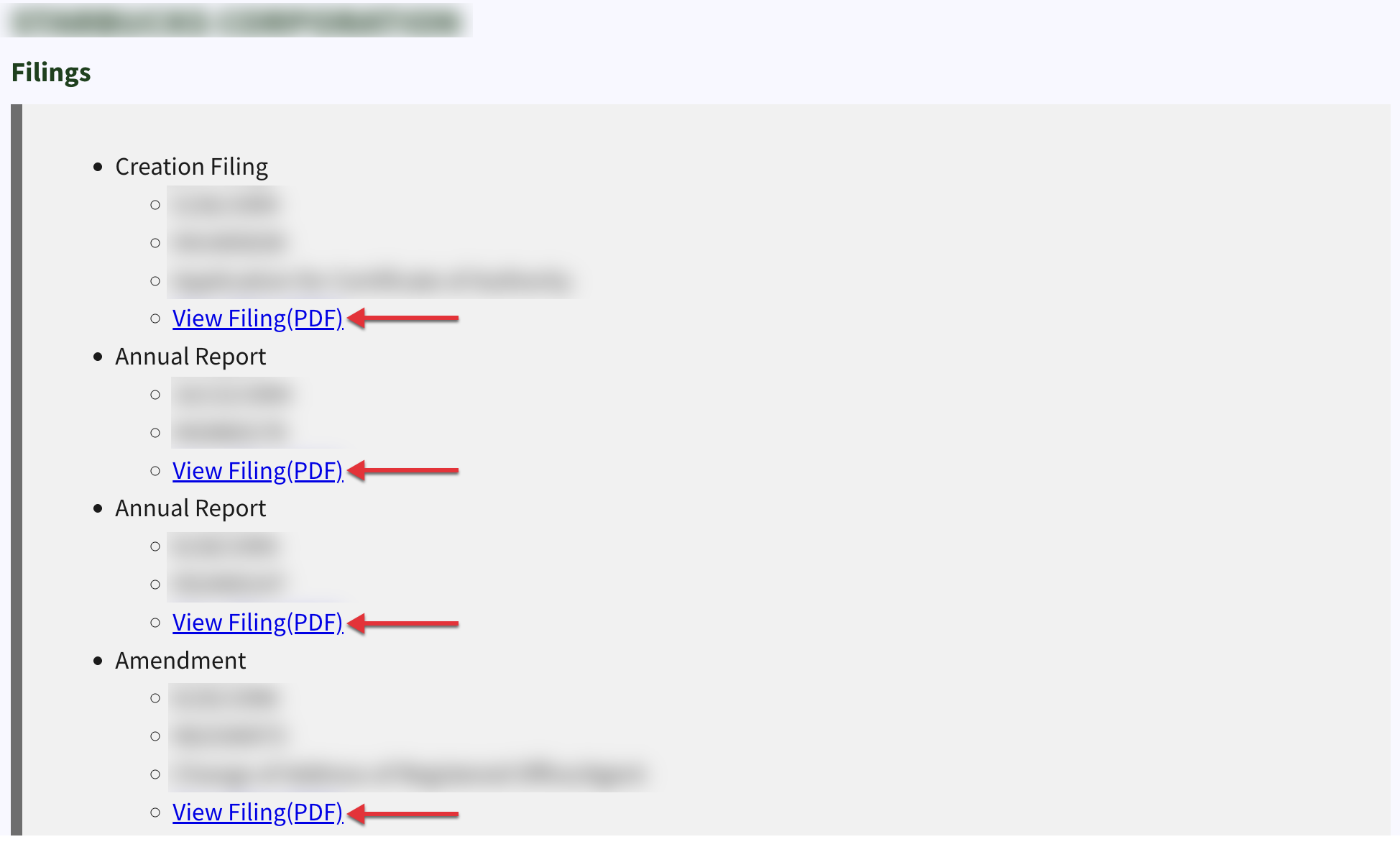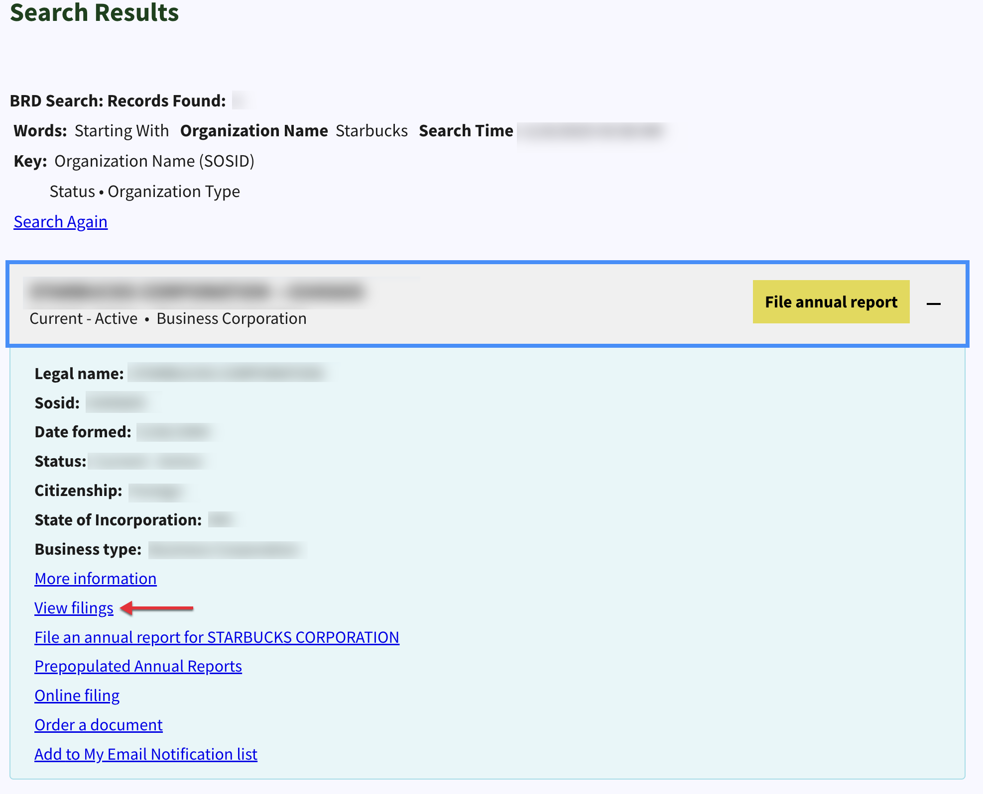 Review the information provided once the “More Information” link is selected. Then, to continue, locate the “View Filings” link near the top of this area to see a history of the entity’s paperwork actions with the state.