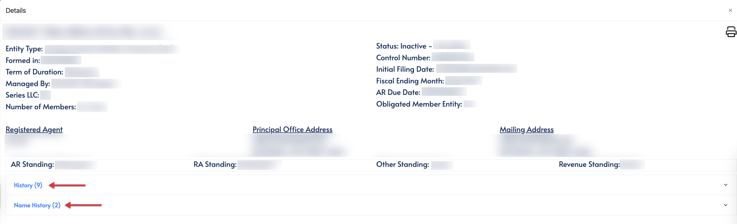 Go through the first half of the page to look over the Tennessee entity’s current information. Notice that the information presented will depend on the entity type. Select the “History” tab to view more.