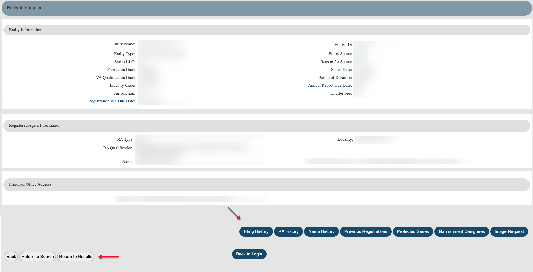 Access the Virginia entity’s historical information using the menu provided in the lower right area of the page.