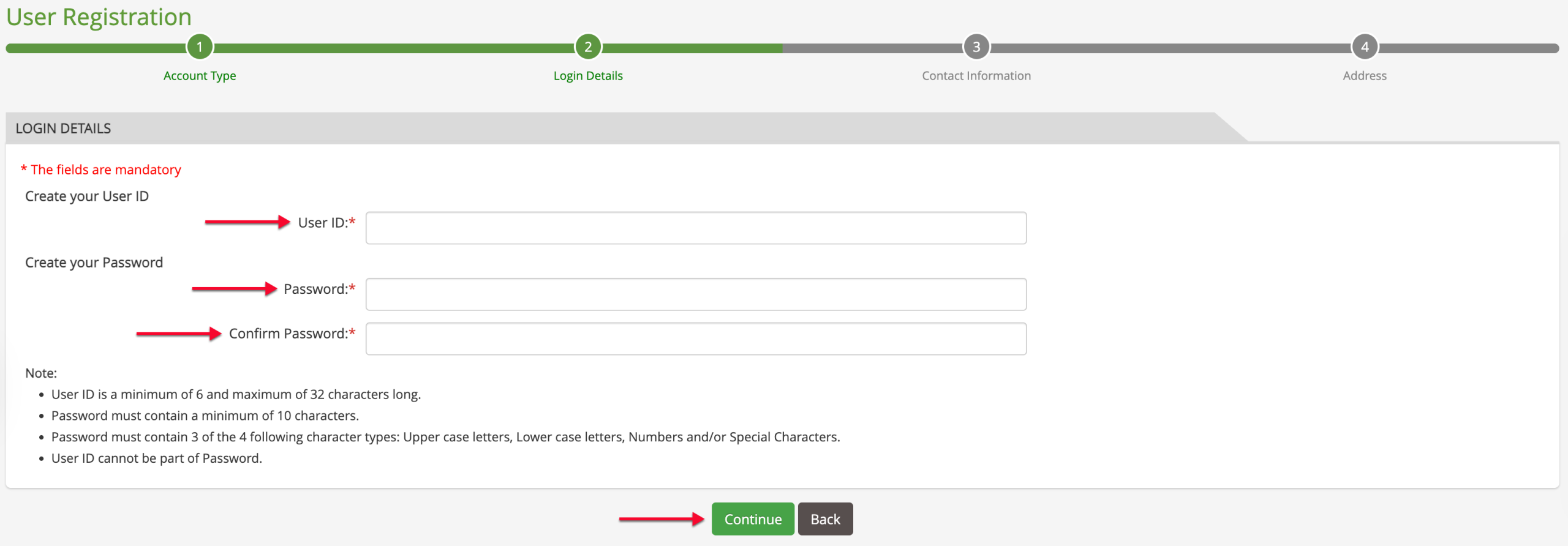 Create the ID you intend to log in, the password, then confirm your password in the available fields before selecting the “Continue” button.