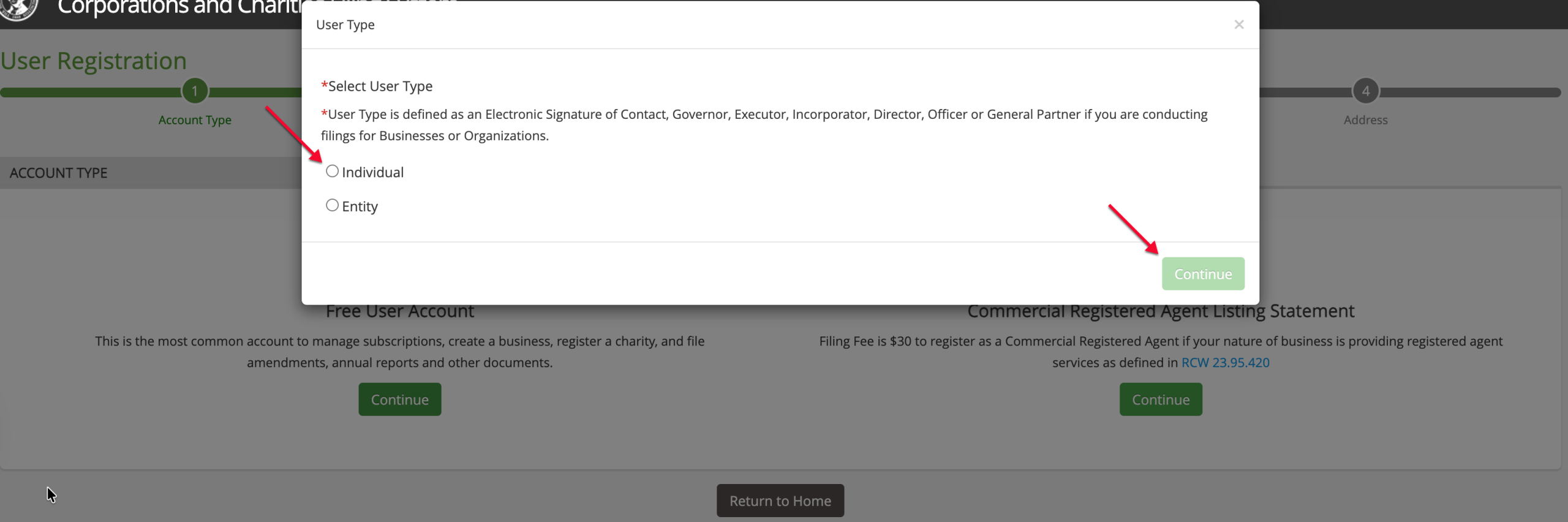 Indicate if this free account is for an individual or an entity using the radio buttons.