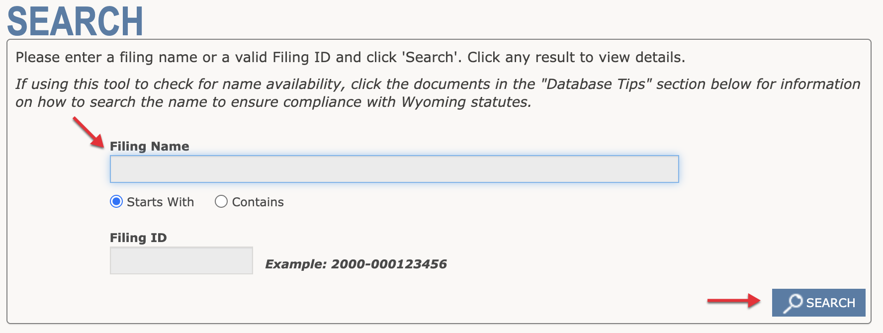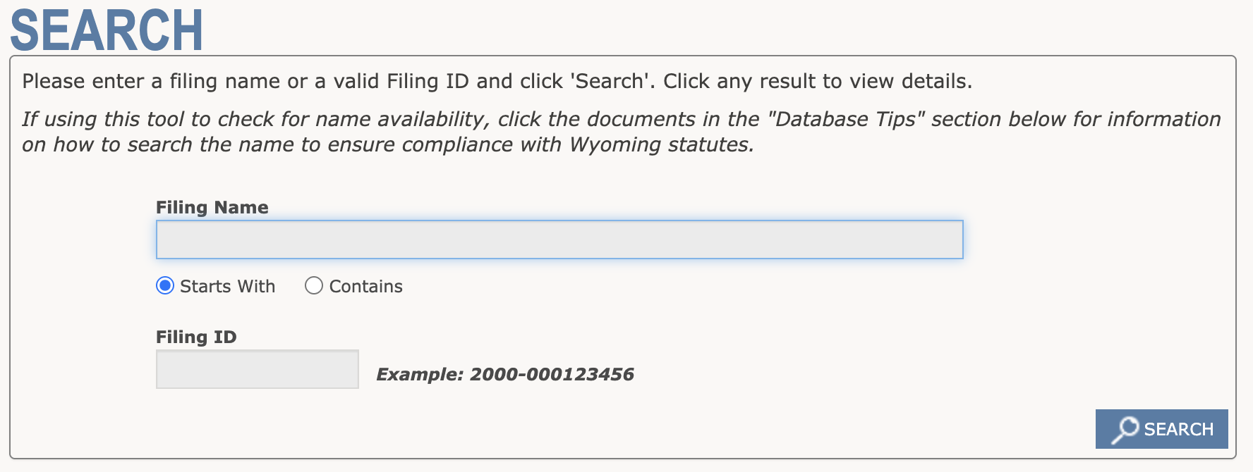 The Wyoming Secretary of State user-oriented business entity search page links directly to a database of registered entities that filed to conduct business in Wyoming. This type of query is useful when investigating the availability of a business name in Wyoming or gaining public information such as an entity’s registered agent. This tool can be used conveniently even if the user does not have the full name of the Wyoming entity being sought.
