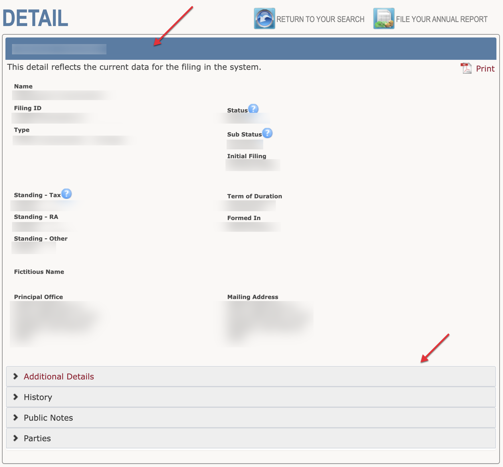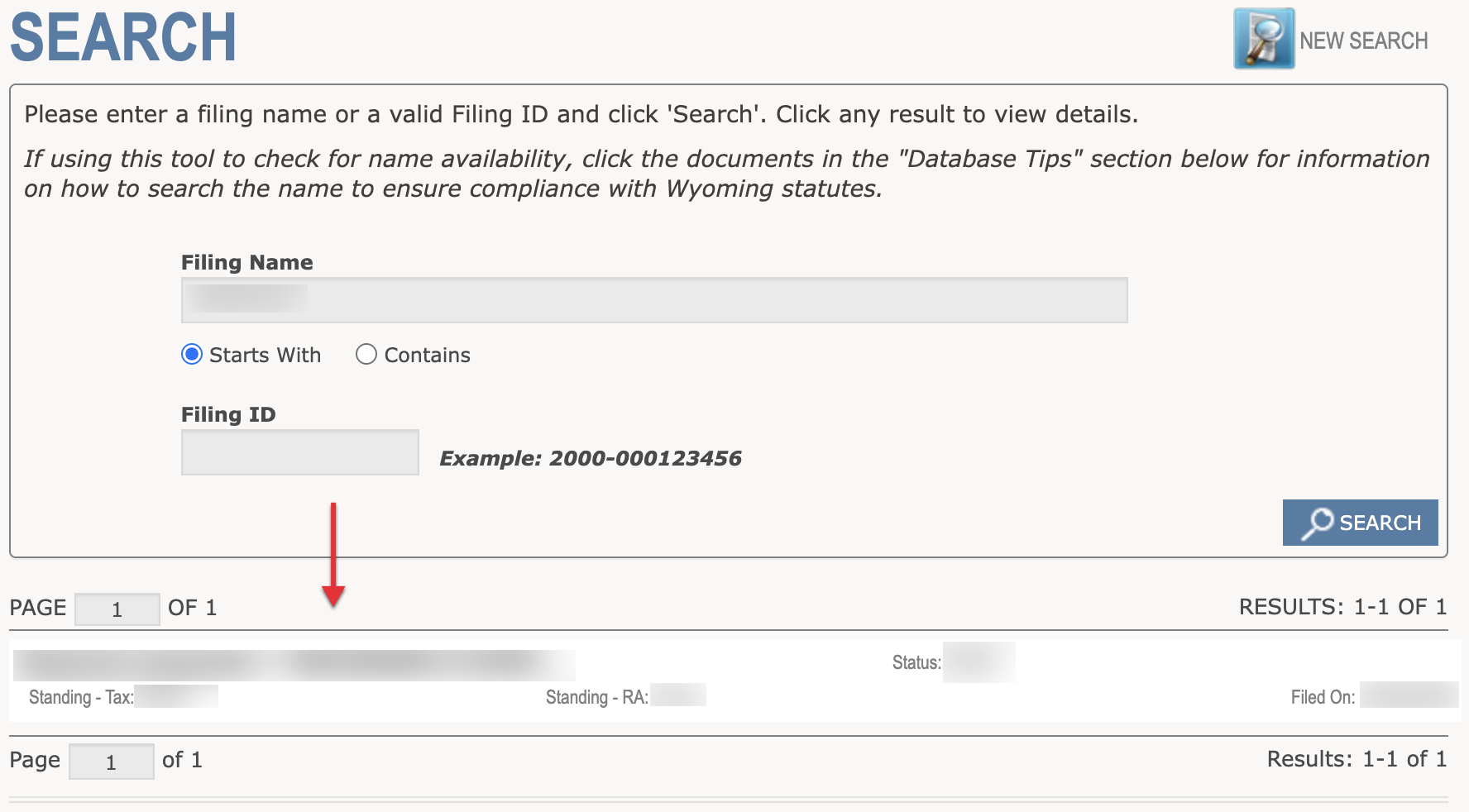 Look through the identifying information for the Wyoming entity on the “Details” page that has been generated after you selected it from the table.